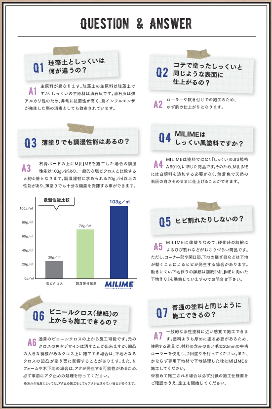 MILIMEは、ローラーや吹付等の塗装施工ができる画期的な本格しっくいです。塗装施工によって、本格しっくいでありながら短納期・低コストを実現できることから、一般住宅はもちろん学校や病院など大空間の広い壁を仕上げる材料としても適しています。また、しっくいが本来もつ抗ウイルス・抗菌・消臭・調湿などの機能性も備えているため、カビや湿気、ニオイなど室内空間が抱える様々な悩みを解決できる高性能な内装仕上げ材です。