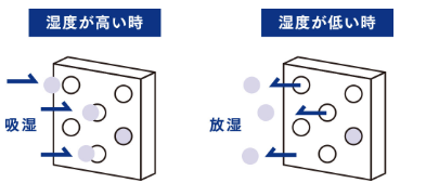 しっくいには無数の細かい孔(あな)があり、湿気を吸収・放出することで常に周囲が快適な湿度にコントロールします。また、この多孔質の表面は、湿気だけでなくニオイ成分を吸着して無臭化する作用もあります。結露や湿気を防ぎ、ペットやタバコ、洗濯物の生乾き臭などを抑えて、快適な室内環境をかなえます。