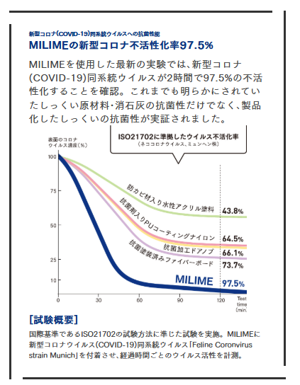 MILIMEを使用した最新の実験では、新型コロナ(COVID-19)同系株ウイルスが2時間で97.5%の不活性化することを確認。これまで明らかにされていなかったしっくい塗料・系石灰の抗菌性だけでなく、製品化したしっくいの抗菌性能が実証されました。